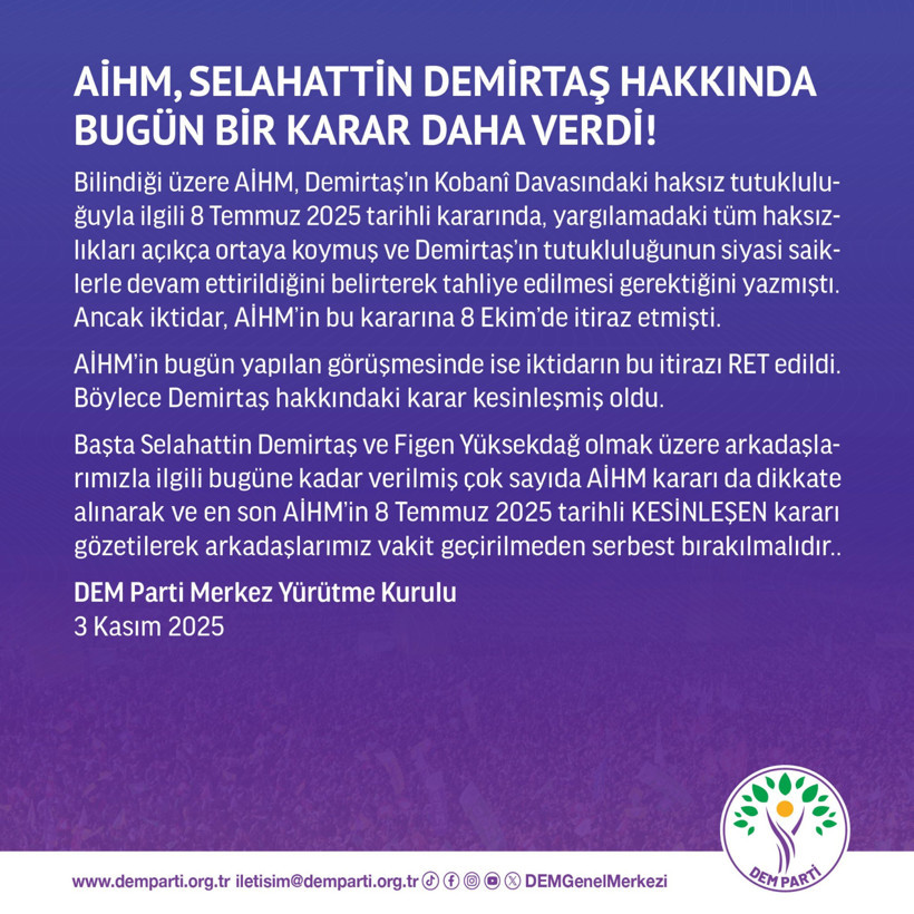 Selahattin Demirtaş ve diğer arkadaşların AİHM kararları göz önünde bulundurularak derhal serbest bırakılması gerektiğini belirten DEM Parti, konuyla ilgili ayrıntıların daha sonra açıklanacağını duyurdu.