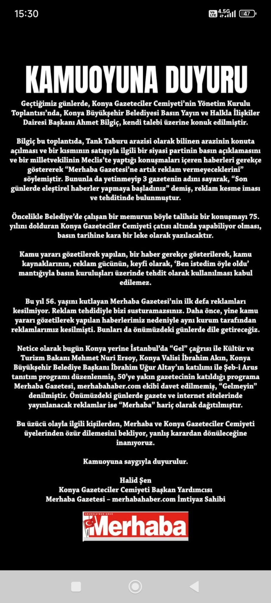Bunun üzerine Merhaba Gazetesi İmtiyaz Sahibi Halid Şen, kamuoyuna duyuru yaptı.