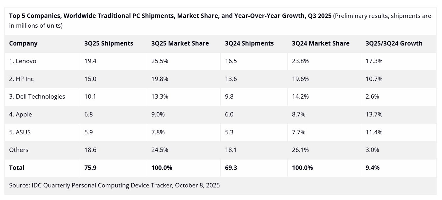 Lenovo üçüncü çeyrekte %25,5 pazar payıyla liderliğini korudu ve yıllık bazda %17,3 büyüme gösterdi. Lenovo’yu, %19,8 payla HP ve %13.3 ile Dell takip etti. Satışlarını %13,7 arttıran Apple ise %6,8 pay elde ederek dördüncü sıradaki yerini korudu.