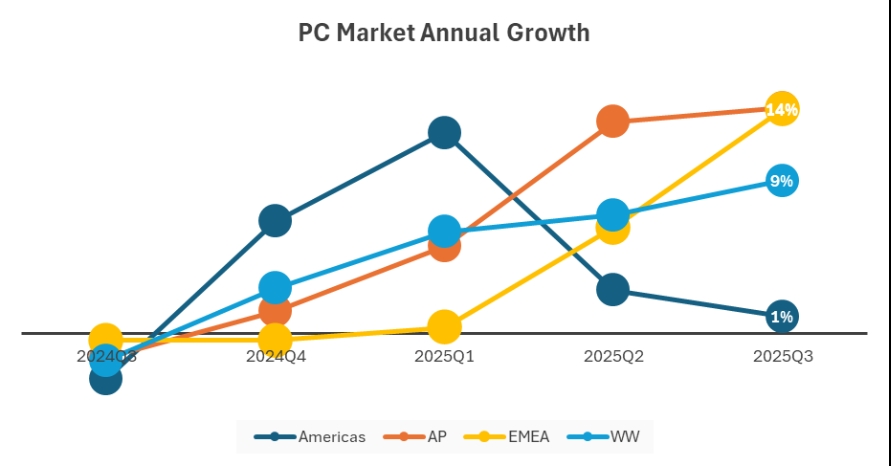 Asya-Pasifik (AP), Avrupa-Ortadoğu-Afrika (EMEA) ve dünya genelinde ise PC sevkiyatları belirgin biçimde arttı. Özellikle Asya-Pasifik bölgesi, 2025’in ikinci ve üçüncü çeyreklerinde yıllık bazda %14’lük bir büyüme yakaladı. Bu artışın başlıca nedeni Japonya ve Çin’deki yüksek talep olarak gösteriliyor.